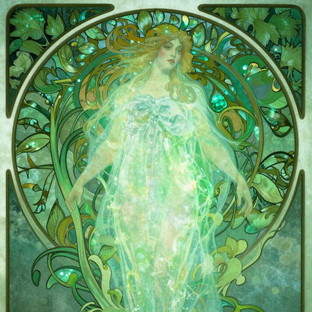 A lone phantom spirit glows with dominant green hues in an Art Nouveau design. Flowing botanical patterns and organic frames enhance the ethereal, mystical atmosphere.