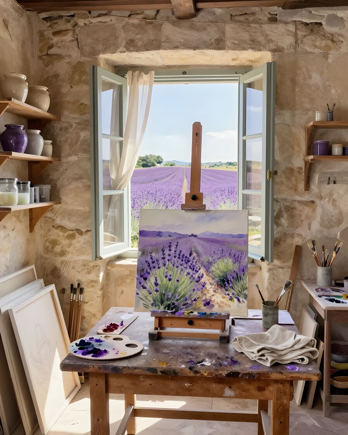 This image depicts a sun-drenched artist's workshop in Provence, featuring rustic furniture, art supplies, and unfinished canvases. A window reveals a calming lavender field outside, rendered in a soft watercolor style.