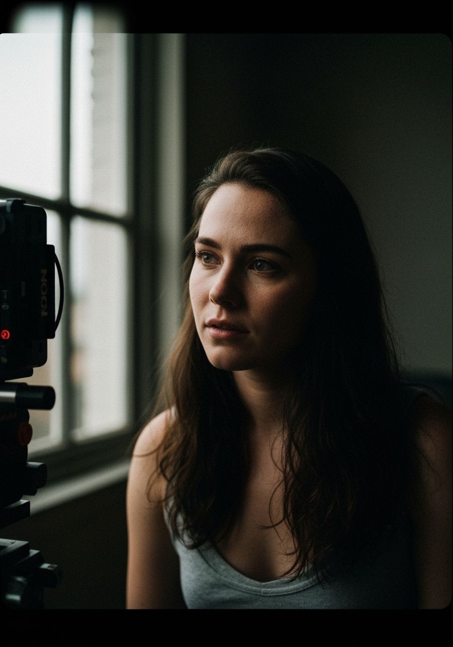 A striking picture of a beautiful zombie woman with pale skin, draped in a light robe. The image has cinematic lighting and a dramatic, atmospheric feel, as 35mm film.