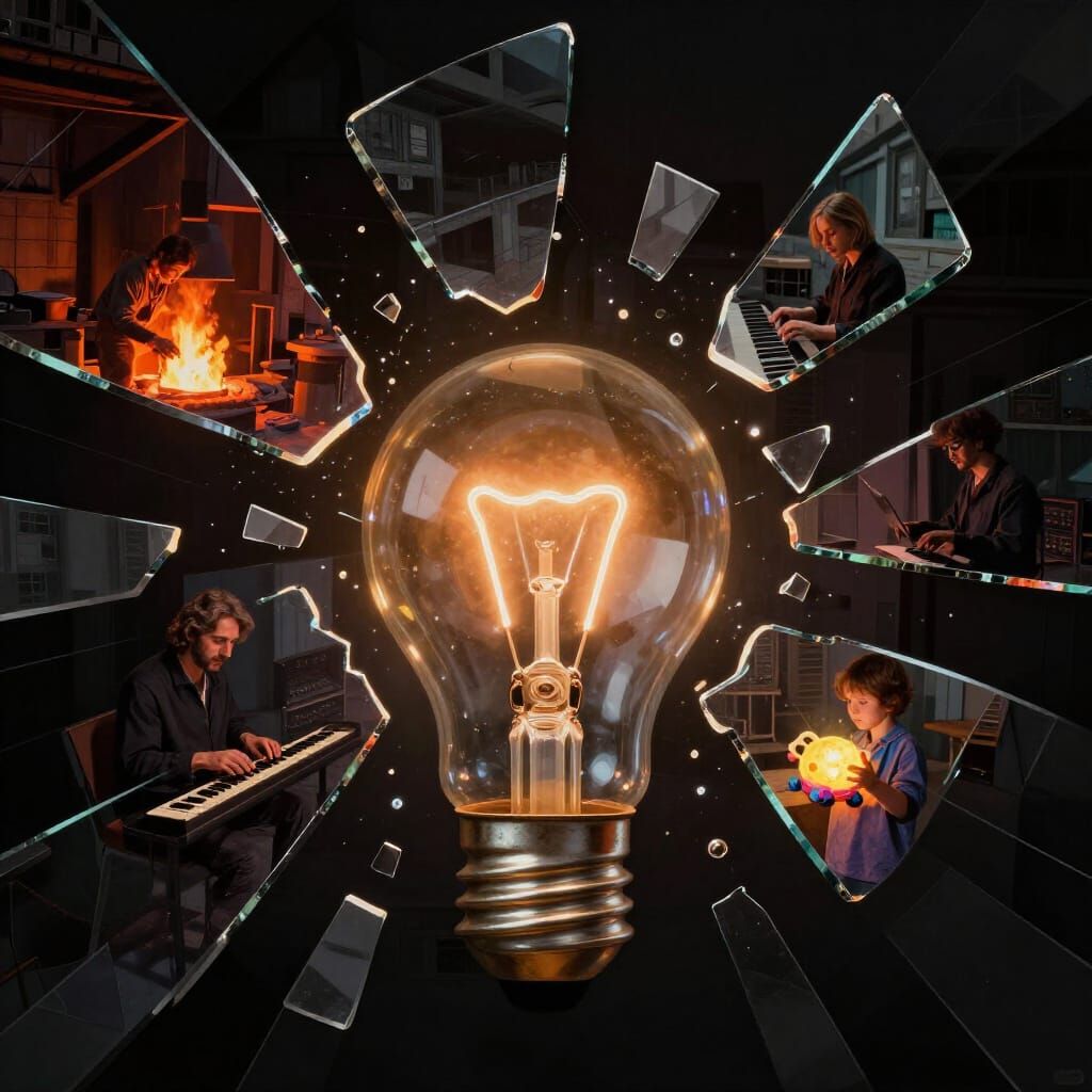 This abstract expressionist image captures intense focus with a shattering light bulb. Fragments reveal micro-scenes of creation and concentration, rendered with sharp geometry and high contrast.