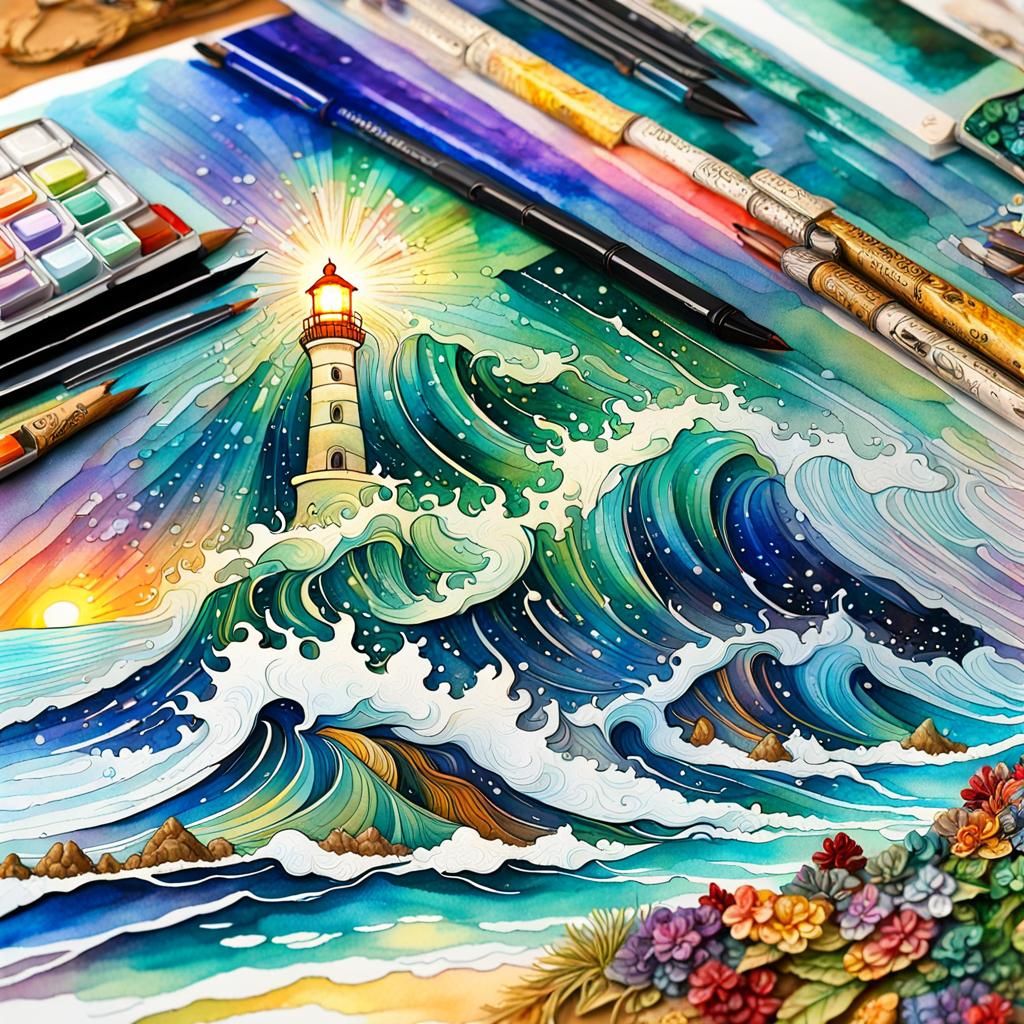 A vibrant watercolor painting of a chaotic winter seascape featuring a lighthouse. The artwork employs deep, shimmering colors and intricate details in a fantastical style.