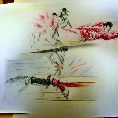 This image shows a dynamic pencil sketch of a Japanese sword fight, complete with blood splatter. The artwork captures the intensity of the duel.