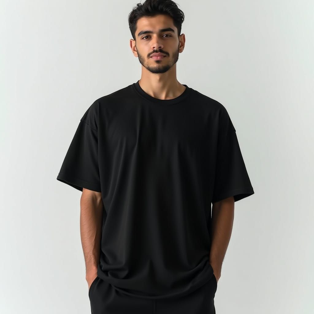 This image showcases a young man with strong Middle Eastern features, dressed in a loose-fitting black t-shirt with visible weave and texture, set against a sleek white studio backdrop with soft, even lighting, highlighting realistic fibers and subtle details.