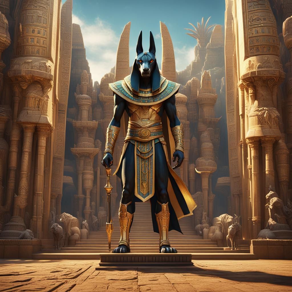 This image shows Anubis in a detailed matte painting style. It features deep, complementary colors and intricate details, reminiscent of fantasy concept art rendered in high resolution.
