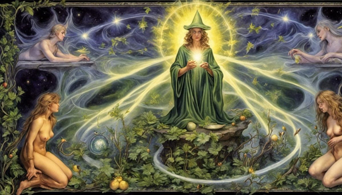 This image shows a hidden society of witches, warlocks, and faeries practicing magic. The artwork evokes hyper-adaptive flora, fractal patterns, and harmonic frequencies, rendered as digital art.
