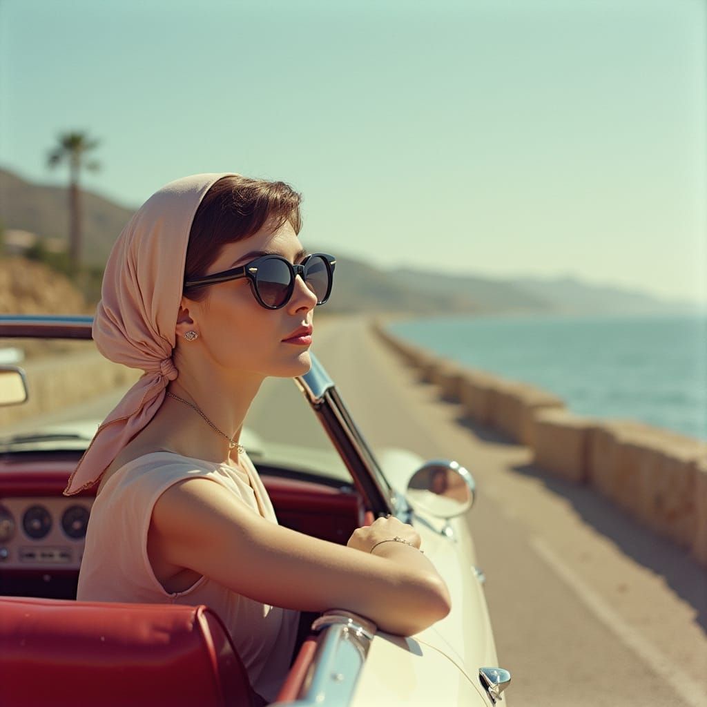 This image shows a woman in a headscarf and sunglasses in a vintage car, looking towards a sunny coastal road. The image evokes luxurious lifestyle photography with soft, diffused lighting and pastel colors.