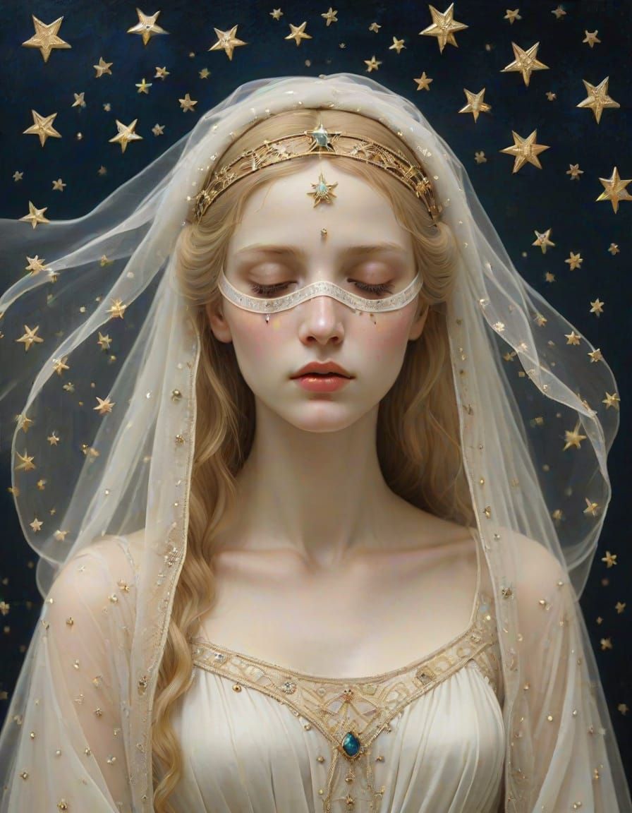 Easily generate your own unique bride images with a starry blindfold, free and simple with our AI.