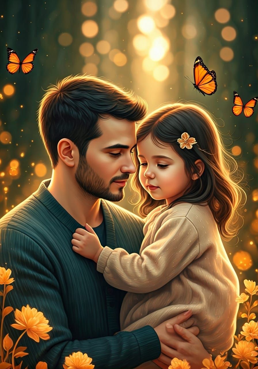 A digital painting of a father and daughter amidst glowing butterflies and flowers. Soft skin tones, flowing hair, and warm light create a dreamy, cinematic atmosphere with bokeh effects.