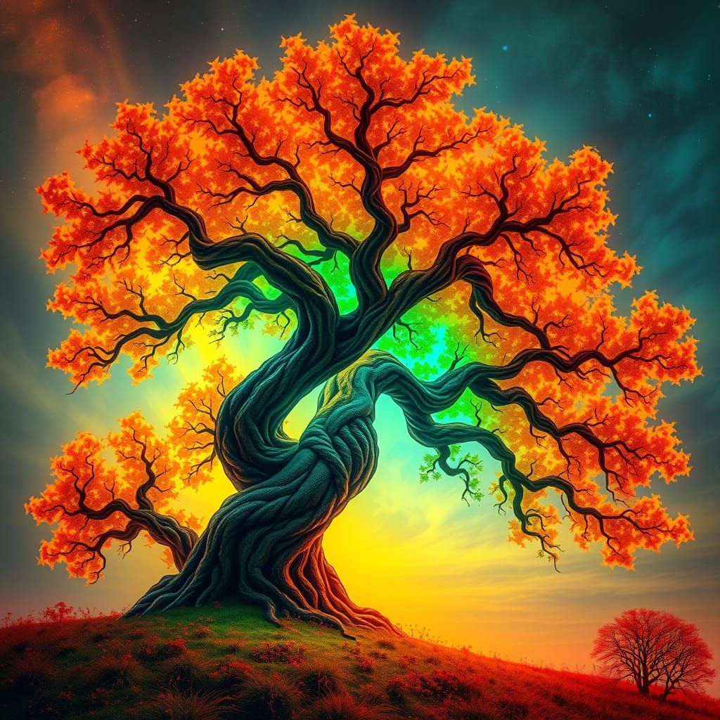 This vibrant surrealist artwork depicts a sculpted magical tree with glowing, luminescent leaves in shades of orange, green, and red, creating a mesmerizing display of color and light.