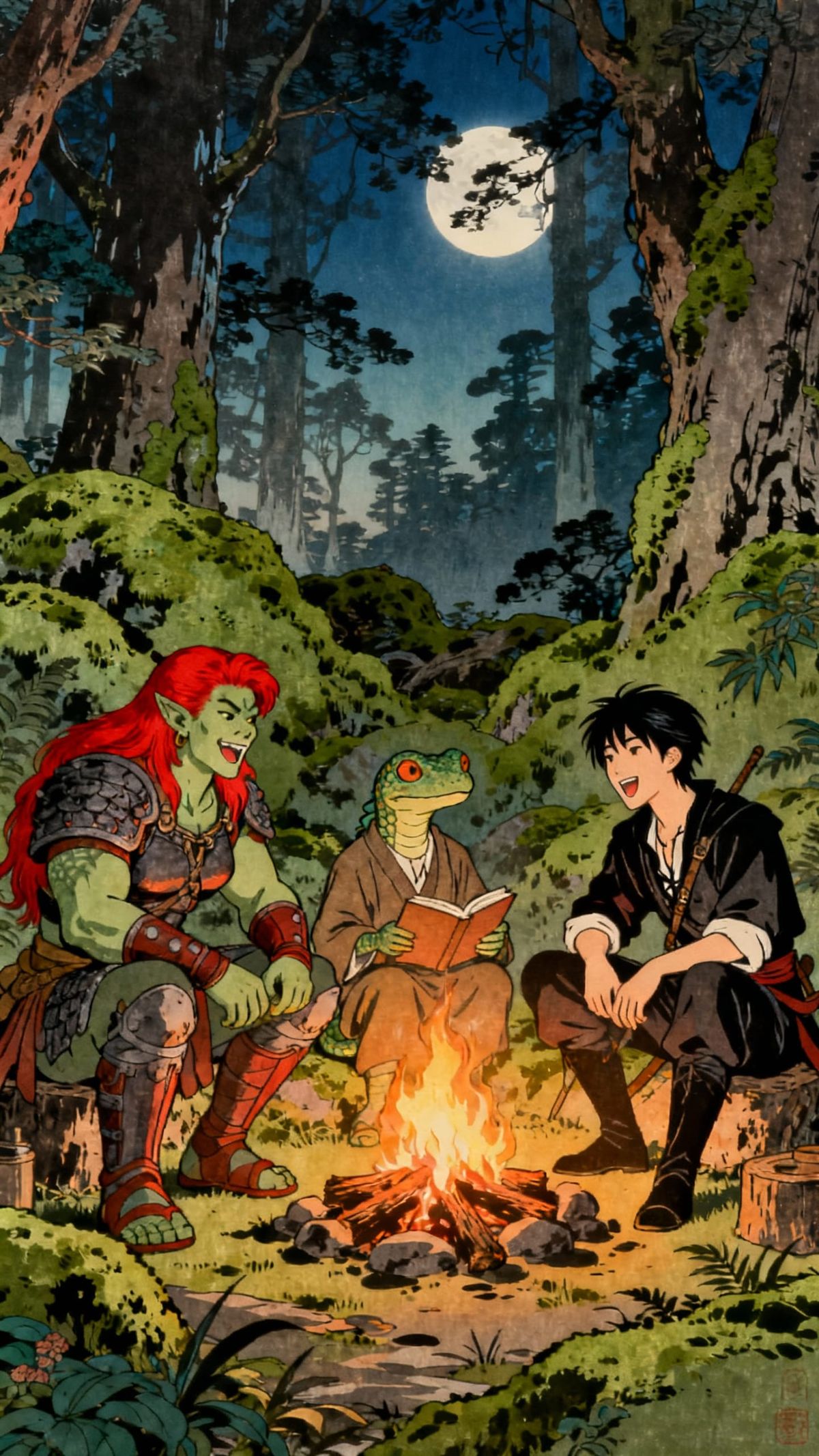 This image depicts an orc warrior, a reptile chronicler, and a goth thief by a campfire in a forest clearing. The artwork features bold lines and vibrant colors in a traditional Japanese woodblock print style.
