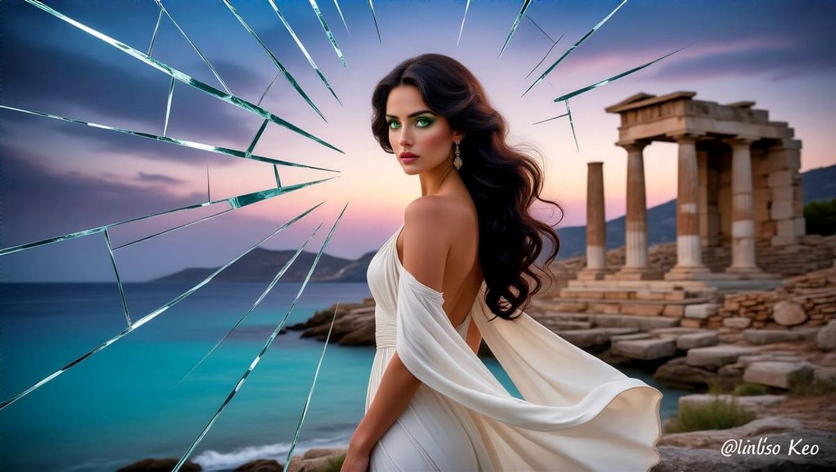 A mystical woman stands by the Aegean Sea, surrounded by shards of light and ancient ruins, amidst a twilight sky with a soft, photo-realistic glow.
