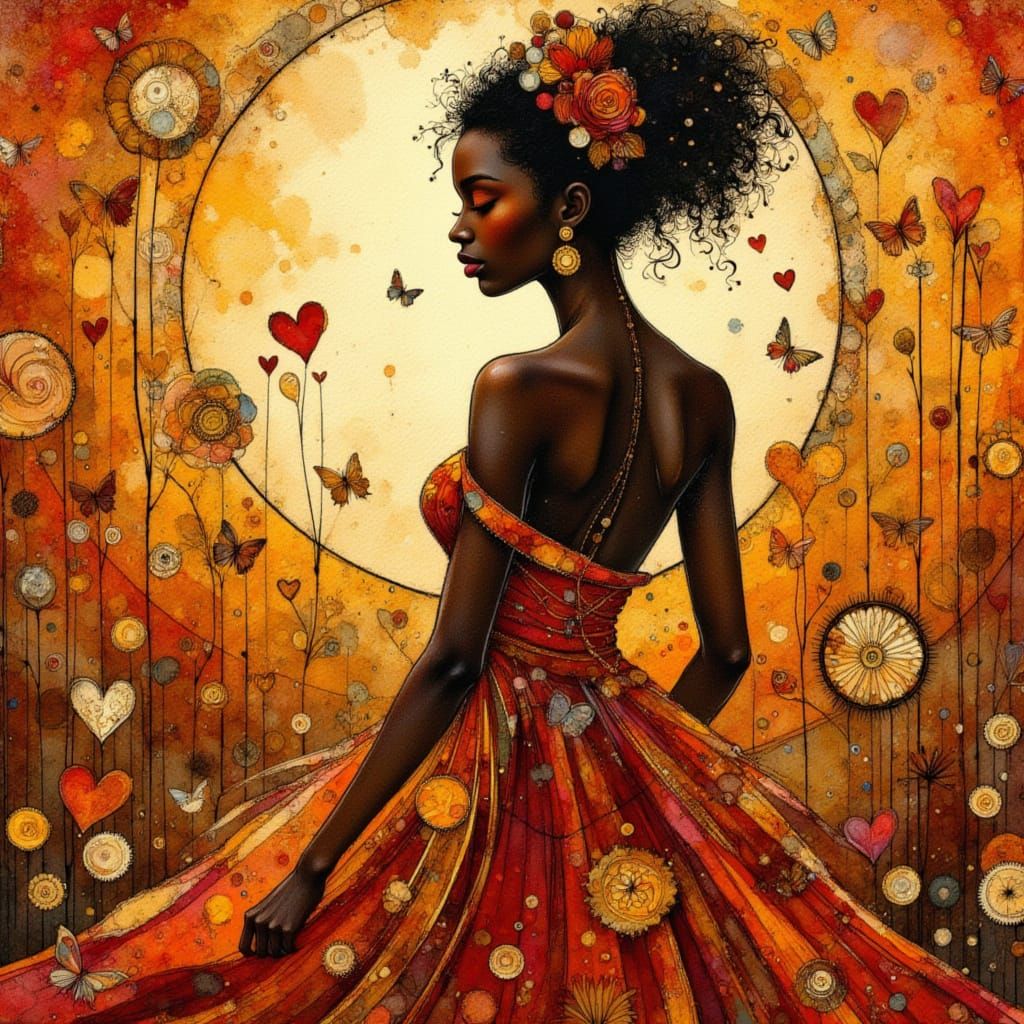 A realistic silhouette of an African princess with a dress that transforms into small hearts. Features encaustic and impasto techniques with gold leaf accents on a detailed art deco background.