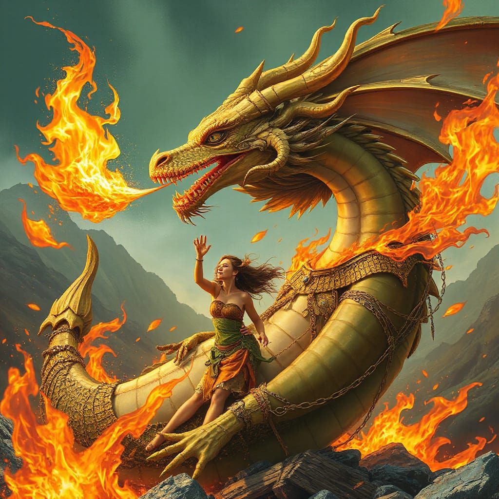 A striking picture of a dragon-woman surrounded by swirling flames and wearing natural attire. The image is infused with vibrant energy and features intricate organic and mechanistic details in a futuristic style.