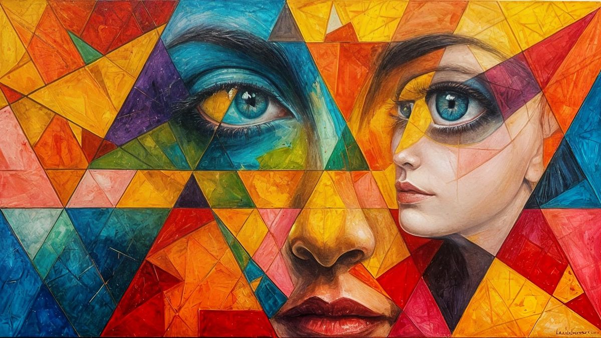 This image shows an abstract digital painting with a cyborg beauty theme. The artwork features linear infinite triangles and an ocre color palette, creating a fantastic and magical aesthetic.