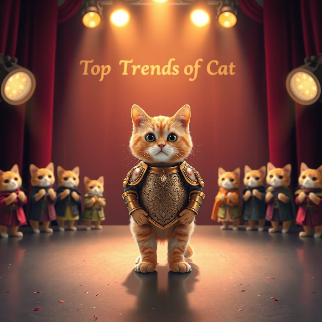 This whimsical illustration features a diminutive ginger cat proudly wearing intricately designed gold-accented armor, surrounded by cheering feline friends on a lavish stage, with a vibrant, gradient lighting effect and a sprinkle of iridescent confetti.