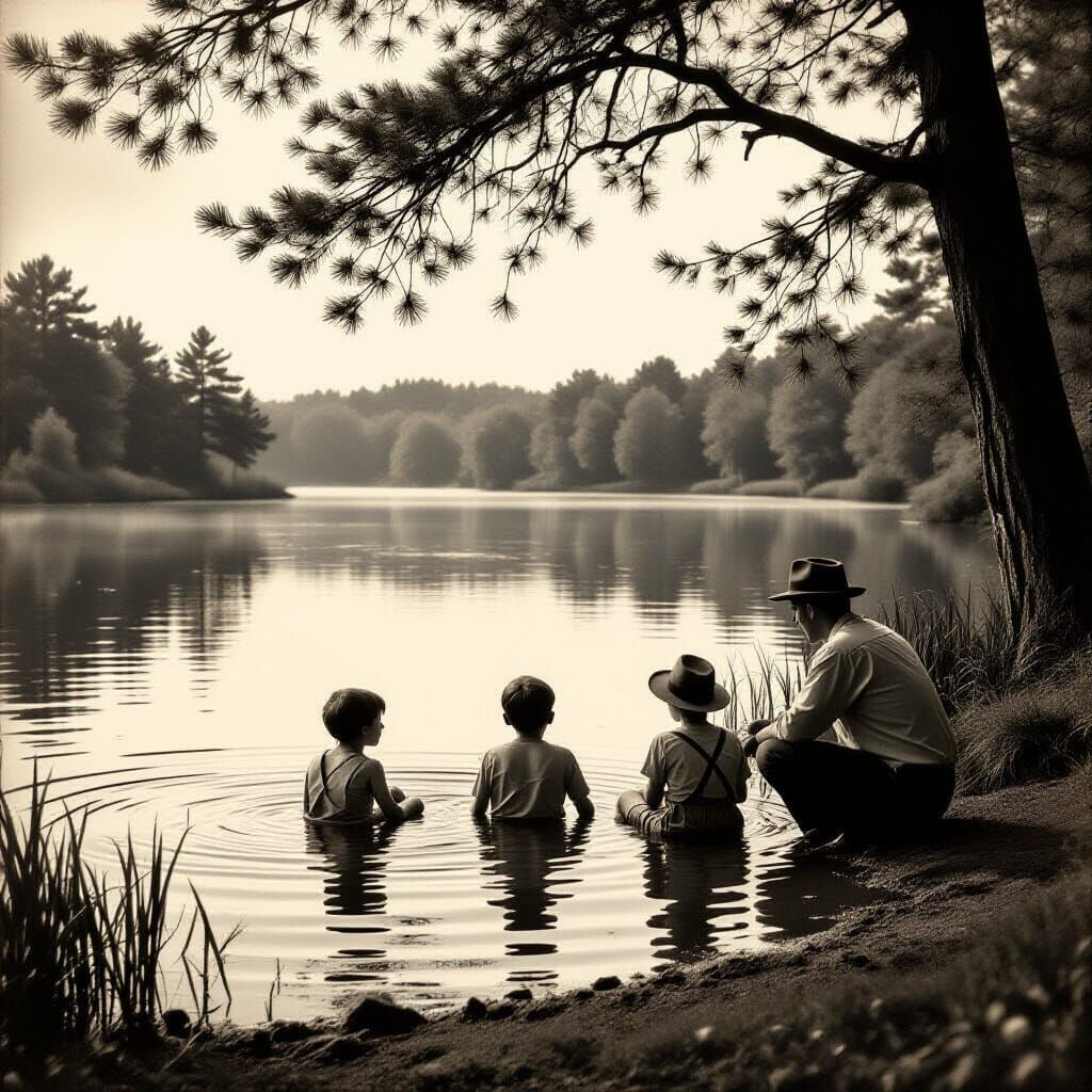 This image shows a sepia-toned photograph in the style of the 1930s. Three children play in a lake as their parents watch from the shore, with vintage bicycles leaning against nearby trees.