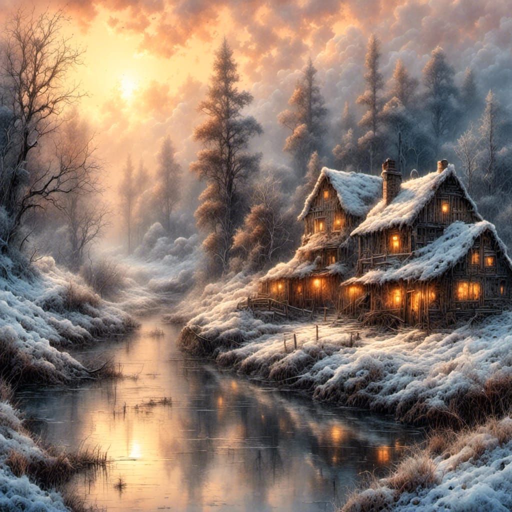 A misty winter sunrise over a ghost town with a creek and ferns, rendered in cool watercolor hues and hyperdetailed ink drawing. This image has an artistic, smoky aesthetic.