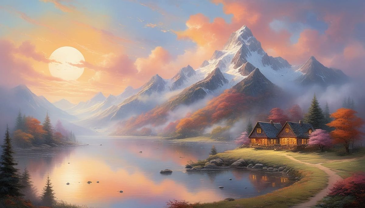 Generate your own AI images of serene lakes and ancient mountains. Free and easy to use!