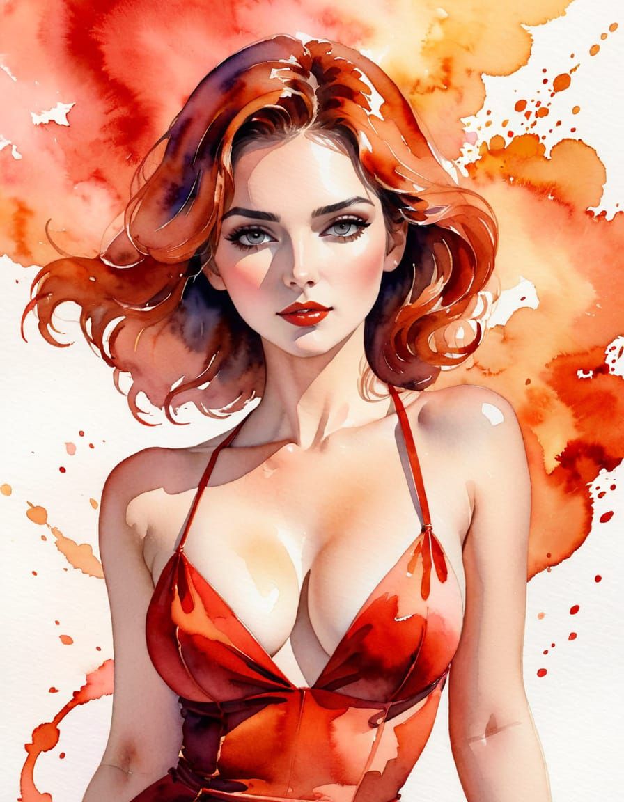 This image features a hedonistic woman against a vibrant watercolor background. The artwork captures a sense of heat and intensity with its bold color washes.