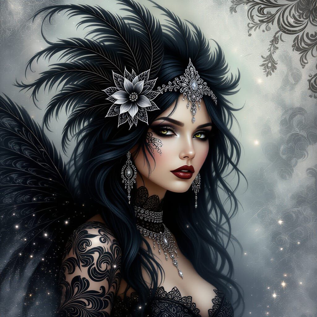 fantastically beautiful gothic museum collection of tropical shaggy sinister harpy, swirl of sparks, fantasy art, ultra detail, hyperrealism, glitter and shimmer, paisley, floral print, fine details, bokeh and shimmering dust, fog, dark world, paint splatter, silver/beige