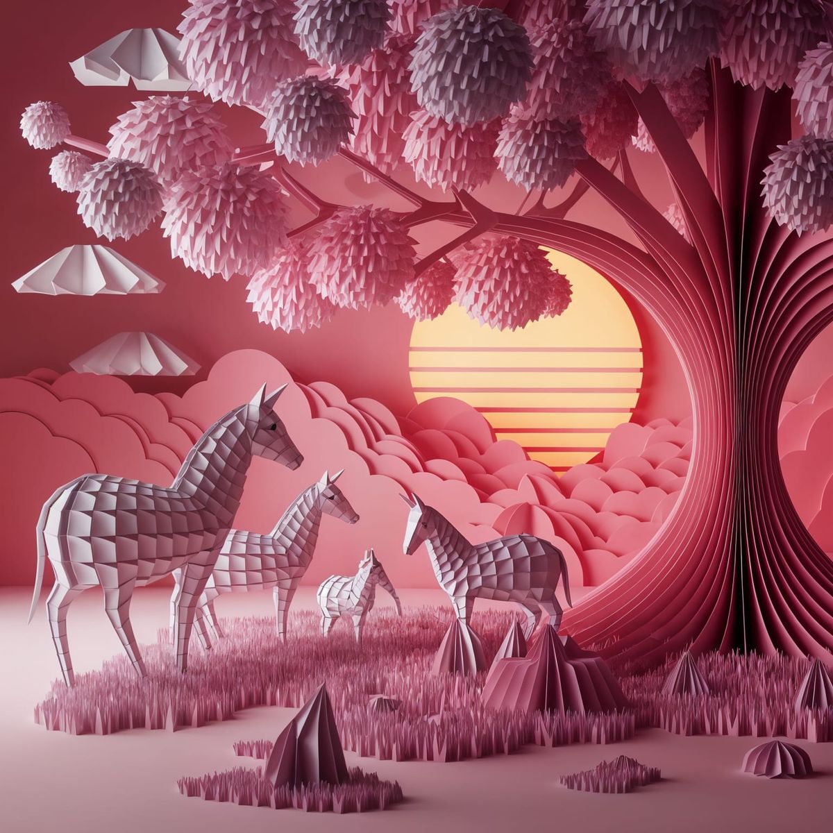 A detailed origami pony stands in a vibrant grassland world crafted entirely from folded paper. Features include origami animals and trees at sunset, rendered with thick brush strokes in an impasto gouache style.