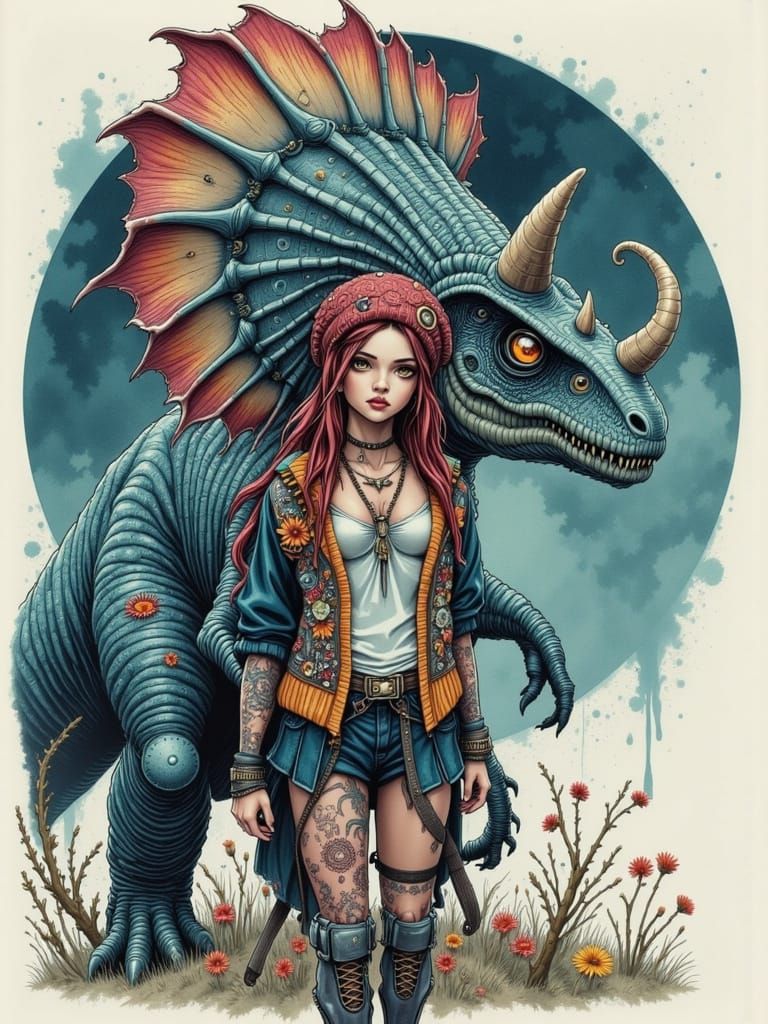 A limited-palette water-colour painting of a young woman (triceratops-pattern cardigan and skirt; brontosaurus-pattern toque; pteranodon-pattern tattoos) standing in front of an ankylosaurus. Teal/maroon gradient back-lighting; intricate details; perfect anatomy; pinup style <lora:Moony:0.6> <lora:Sharr:0.3> ...