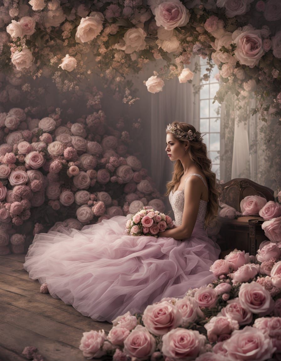 This image shows a beautiful, muscular woman in a wedding dress amidst a sandstorm. She holds a colorful bouquet, with desert structures faintly visible. Rendered with photorealistic detail.