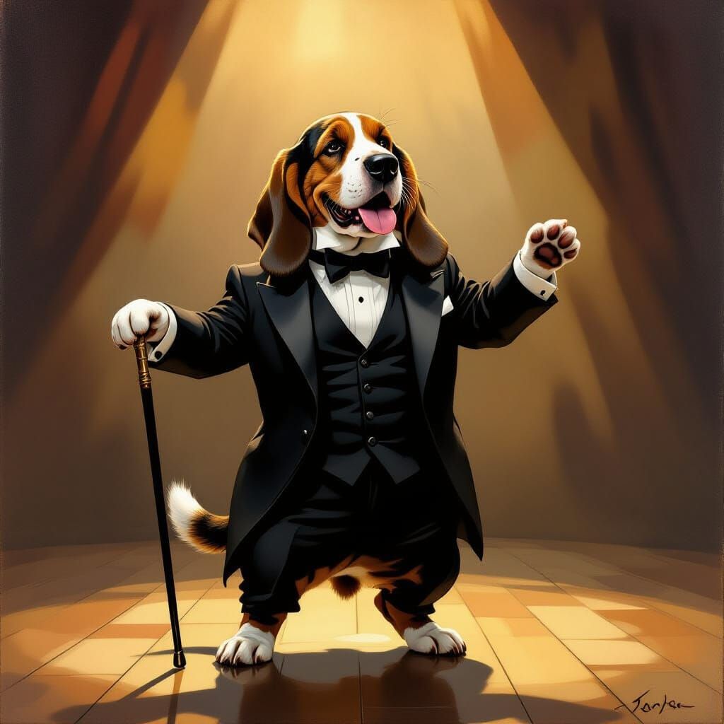 A Basset Hound in a sharp black suit dances with a cane on a stage, illuminated by dramatic backlighting. This oil on canvas painting features vibrant colors and dynamic lighting, capturing a lively performance.