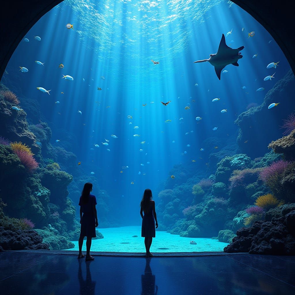 This serene aquarium is softly illuminated, evoking a sense of underwater calm. A majestic, floor-to-ceiling tank teems with vibrant coral reefs, delicate sea fans, and shimmering schools of iridescent fish, creating a breathtaking underwater garden.