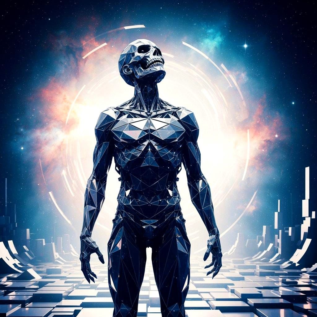 A striking picture of a geometric figure silhouetted against a nebula. This image shows a cubist landscape with fragmented shapes, rendered in a geometric horror style with cyberpunk influences.