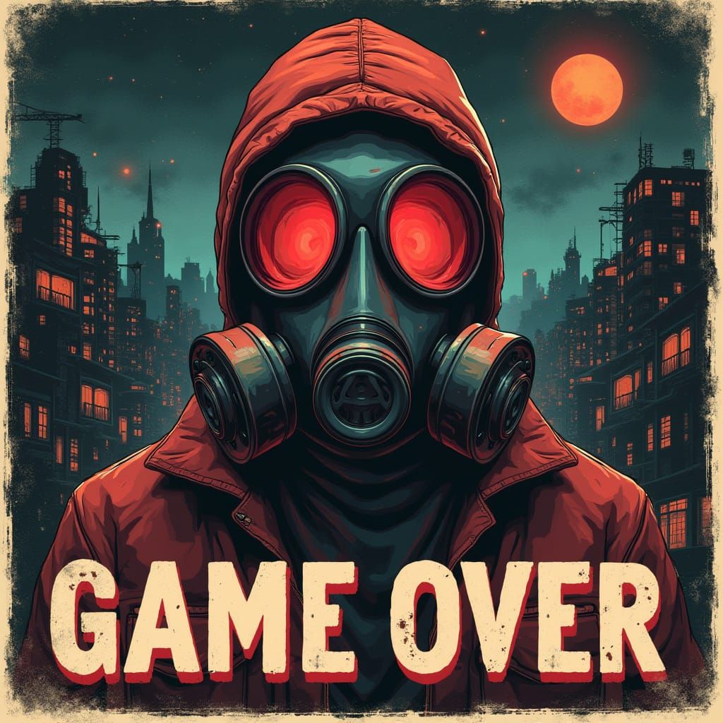 This image shows vintage album cover art featuring a gas mask against a dark sci-fi city backdrop. Bold, retro-style graphics spell out "GAME OVER" in this artwork.