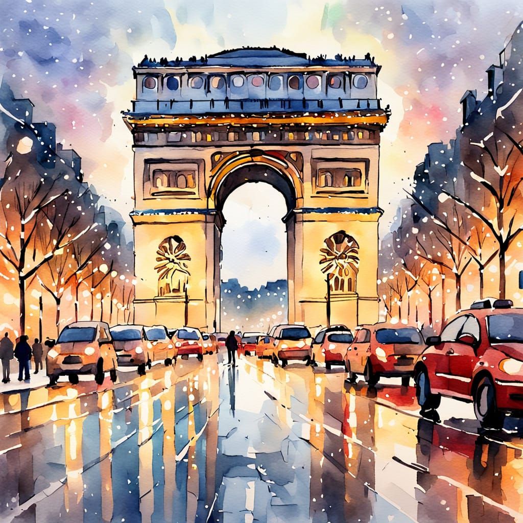 This image shows a painterly watercolor sketch of the Arc de Triomphe during Christmas. It features vivid holiday colors, a soft glow from lights, and golden hour lighting in an impressionistic style.