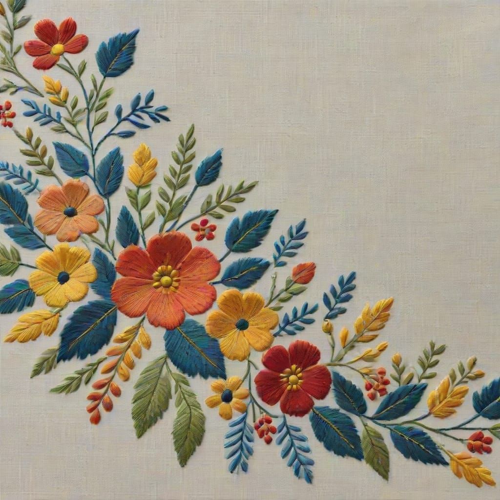 This image shows a warm beige vintage linen background with a delicately faded, hand-embroidered floral border, evoking a sense of timeless elegance and subtle beauty.