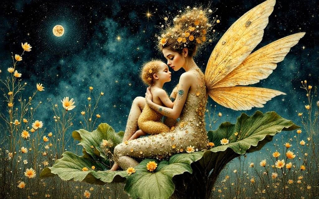 "by Android Jones : intricately detailed fluid gouache painting: by J Japanese Art: James Jean: Erin Hanson: Dan Mumford calligraphy: acrylic:<lora:SuperHyperrealismFlx:1.0> <lora:EtherealVisionsFlux:1.0> <lora:Abstract Reality:1.0> <lora:divineOil:1.0> by Sabbas Apterus realistic highly detailed beautiful fairy wearing a dress made of dew covered daisies, detailed eyes, glowing astral tattoos and large stunning flower petal wings, cradling an adorable baby dragon with big shiny eyes in her arms, sitting with one leg dangling off the ground sitting on a giant leaf, night, stars, dark, Jean Giraud Moebius Style Illustration, Saturated Colors+Psychedelic+Surreal+Mythic+Epic+Large Proportioned Landscape+Retro+retro Sci-Fi+Sci-Fi, 16:9""