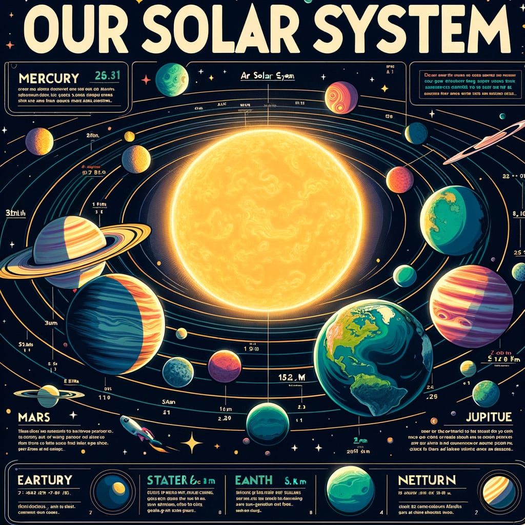A vibrant educational poster illustrating the Solar System for young students. Features the Sun and planets with clear labels and engaging facts about space.