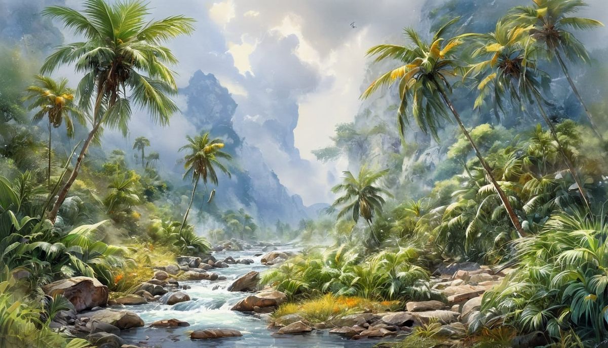 Easily create your own beautiful watercolor paintings of tropical rainforests with our free AI image generator.
