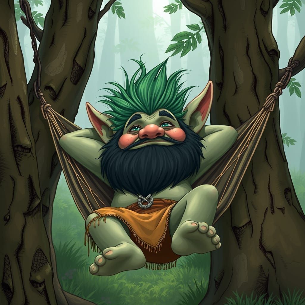 A muscular troll with green hair lounges in a hammock strung between two trees. The troll, clad in a loincloth, relaxes with hands behind his head in this vibrant digital artwork.