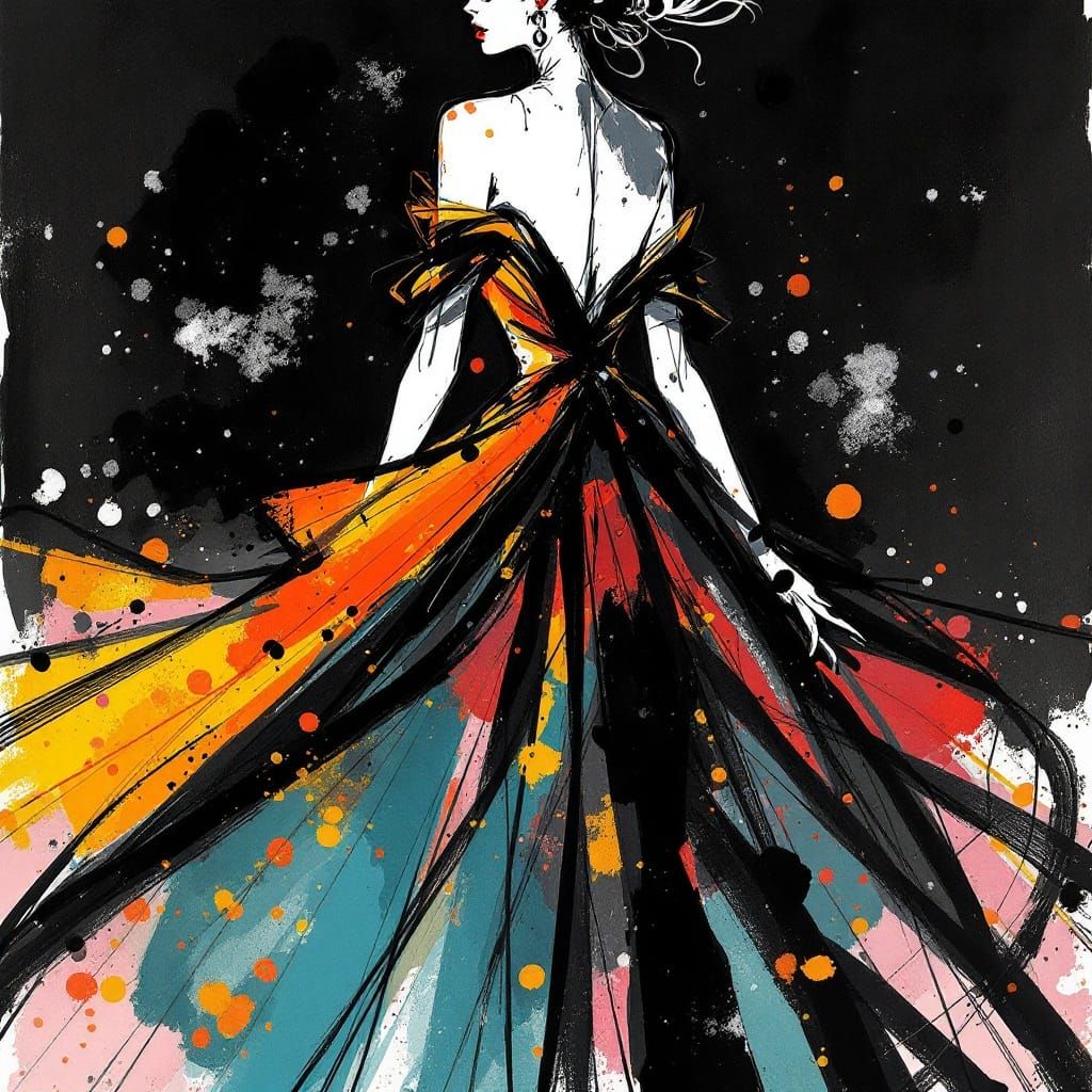 This image showcases a woman in a stunning haute couture gown, captured with bold black ink lines and vibrant color washes, exuding chic, dynamic, and sophisticated allure in a non-realistic, high-fashion style.