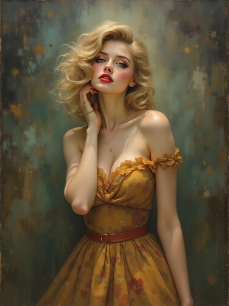 This image shows a full-bodied 1950s blond pin-up woman with bold, direct eye contact. The artwork evokes idealized naturalism with soft edges and harmonious colors, reminiscent of art nouveau painting.