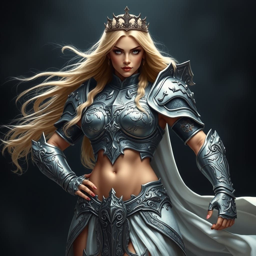 A regal female warrior stands confidently, her powerful physique highlighted by ornate silver armor. She wears a delicate crown and a flowing white gown, set against a dark and atmospheric background.