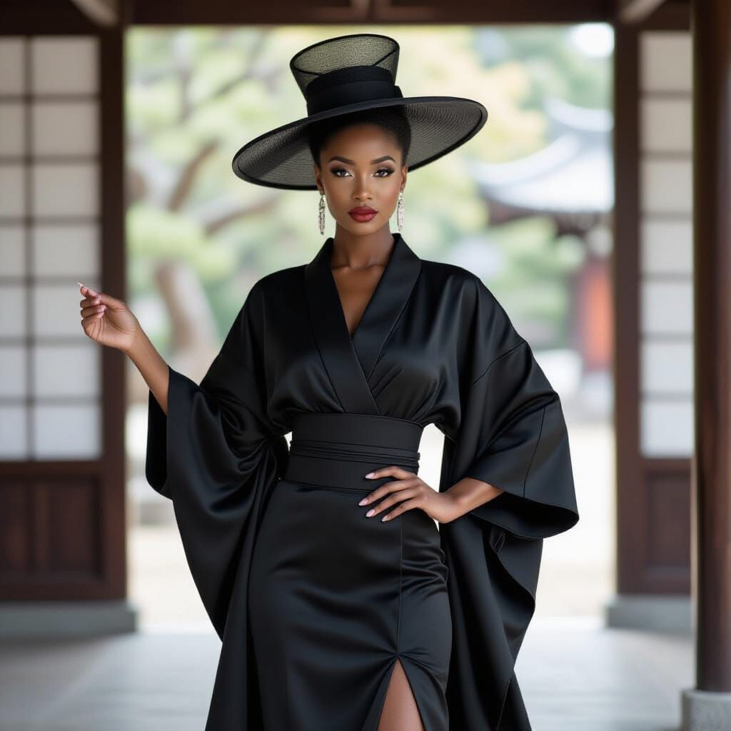 This image features a striking portrait of a Black woman wearing a sophisticated black kimono gown, complemented by an avant-garde glass hat.