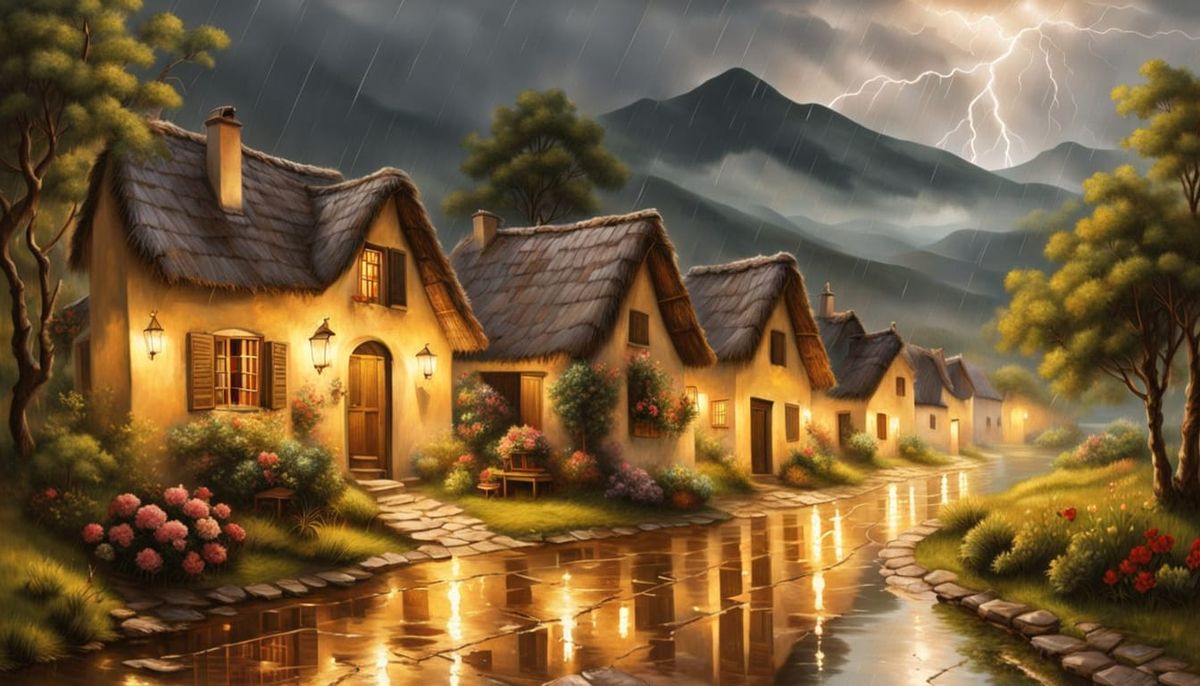 This image shows a mountain village enduring a storm at night. Lightning illuminates thatched roof cottages and reflects in rain puddles, captured with classic baroque oil painting techniques.
