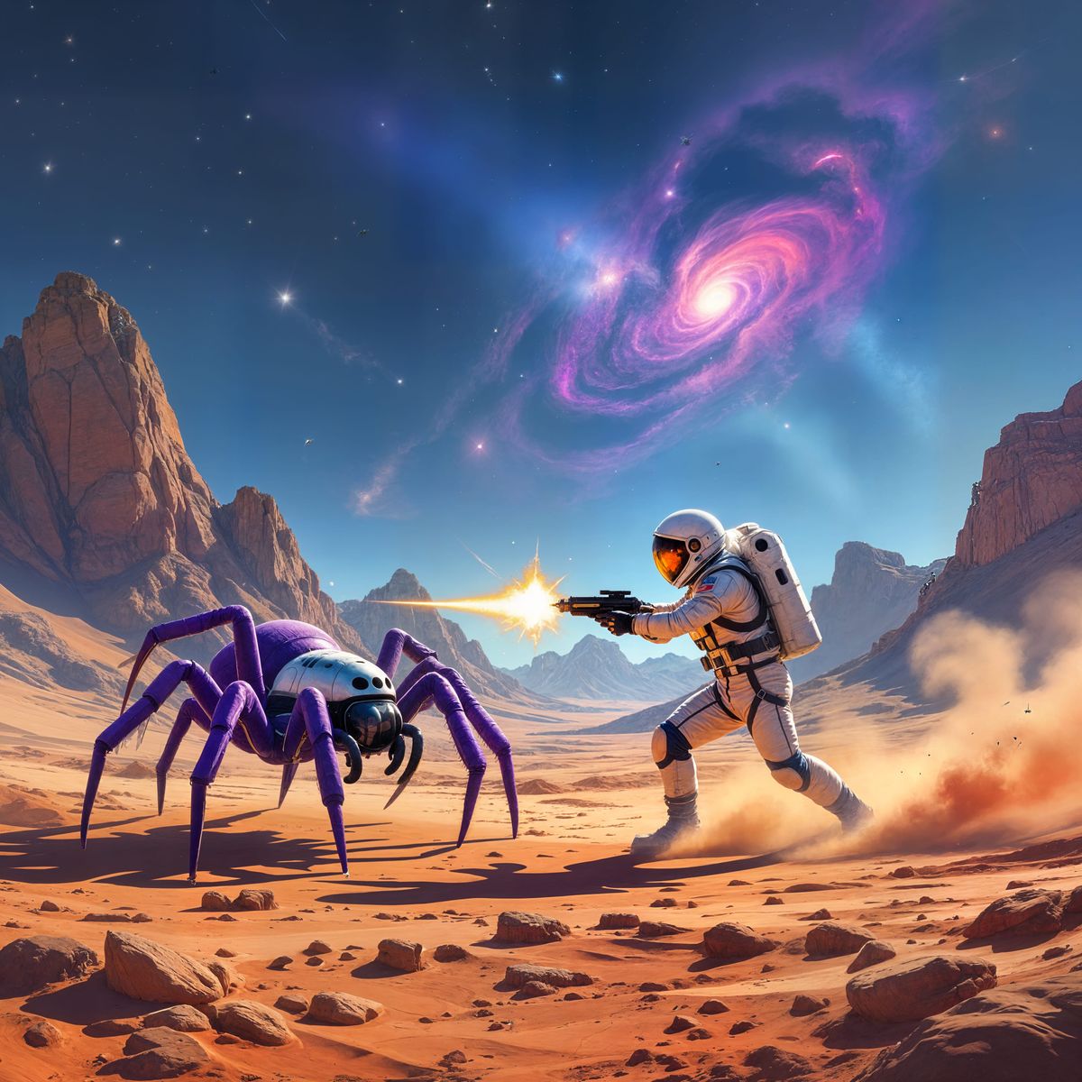 A vintage 1970s-style astronaut battles a massive purple spider on a barren alien world with mountains in the background. This sci-fi scene captures a thrilling extraterrestrial encounter.