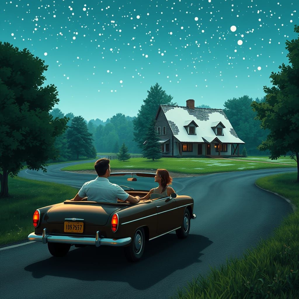 A vintage car stops on a winding road as a lone house is suddenly blanketed in snow, creating a surreal summer to winter scene, reminiscent of whimsical animation and atmospheric lighting