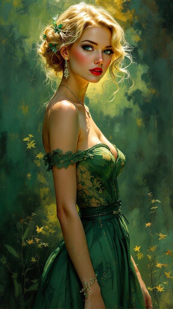 This captivating painting depicts a 1950s pin-up beauty amidst a lush emerald forest, where confident brushstrokes and jewel-toned colors create a sense of depth and authenticity.