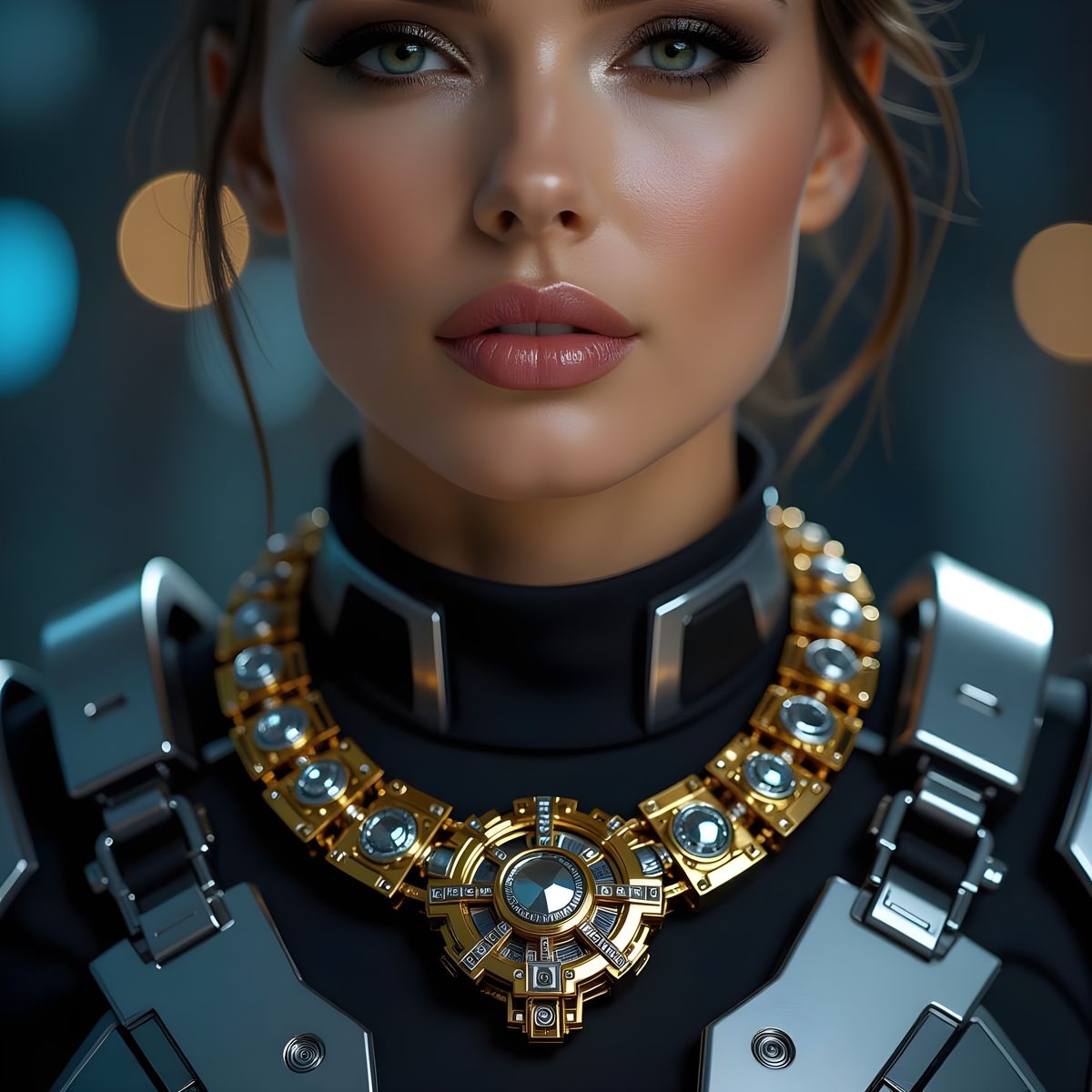 This image shows an intricate gold and silver necklace with mechanical details. The futuristic design has a cinematic and dramatic atmosphere, rendered as polished metal with bokeh effects.