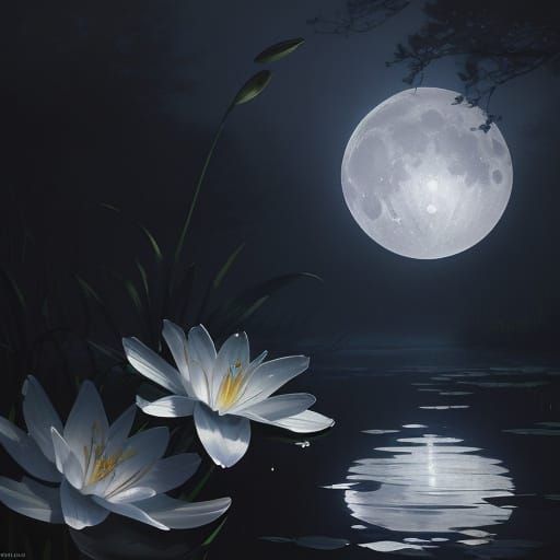 This image showcases a detailed, atmospheric concept art piece of a lily emerging from a moonlit pond. The artwork features delicate petals reflecting celestial glow in cool blues and silvers.