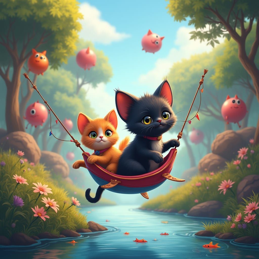 This image shows a vibrant amusement park populated by playful cats enjoying the attractions. Digital illustration with vivid colors, it evokes a magical, fairy-tale atmosphere with realistic textures and soft lighting.