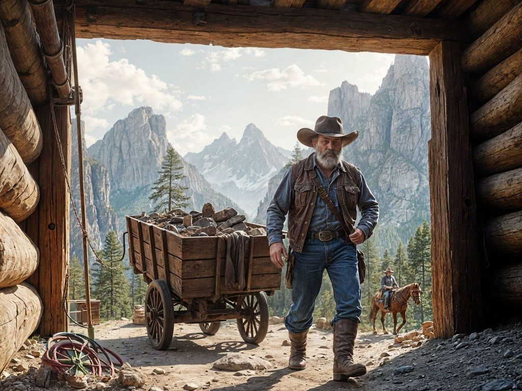 "Photorealistic digital painting of an 1800s gold prospector exiting a wooden-timbered mine entrance, pushing a wooden ore cart filled with rocks. Set in Rocky Mountains with towering granite cliffs and pine trees. Dynamic composition framed by mine timbers. Detailed period-accurate clothing: worn denim, leather vest, cowboy hat, and boots. Natural morning light filtering through canyon. Hyperrealistic textures on weathered wood, metal fixtures, stone, and fabric. Cinematic lighting with atmospheric perspective and dust particles. 8K resolution, professional color grading. oil painting by James Gurney"