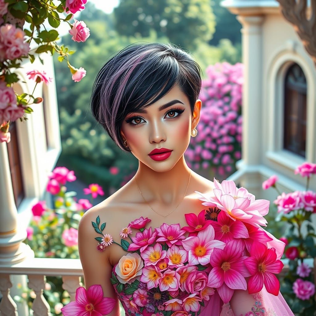 A captivating woman stands on an ornate balcony surrounded by a lush garden of blooming flowers, wearing a stunning, vibrant flowing dress adorned with colorful flowers, in a realistic and whimsical airbrush oil painting style